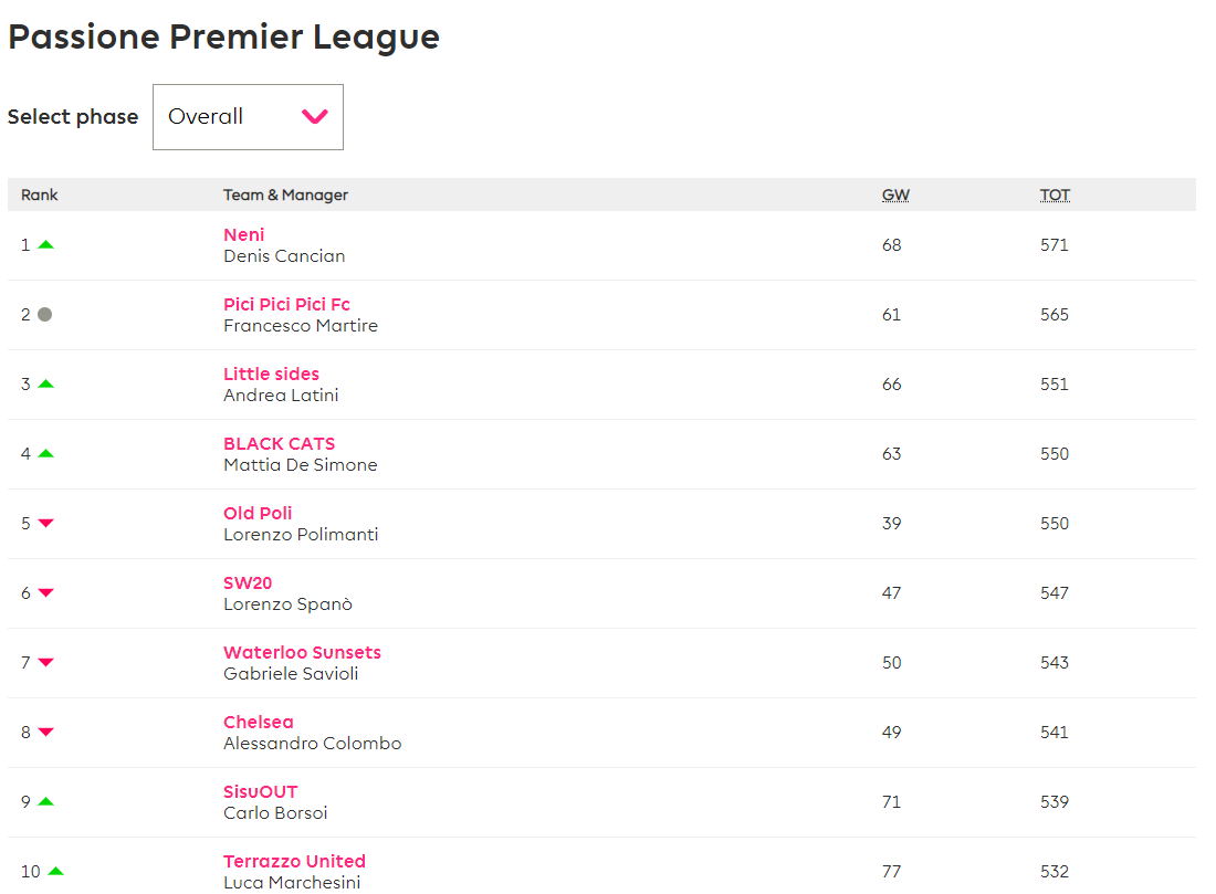 Con le partite di domenica scorsa si è conclusa la decima giornata della Premier League. Eccoci quindi pronti a vedere la classifica del nostro Fantasy dopo 10 giornate. Cambio di leader, al comando troviamo Neni di Denis Cancian con 571 punti. Seguono e completano il podio, Pici Pici Pici FC di Francesco Martire e Little sides di Andrea Latini, rispettivamente con 565 e 551.