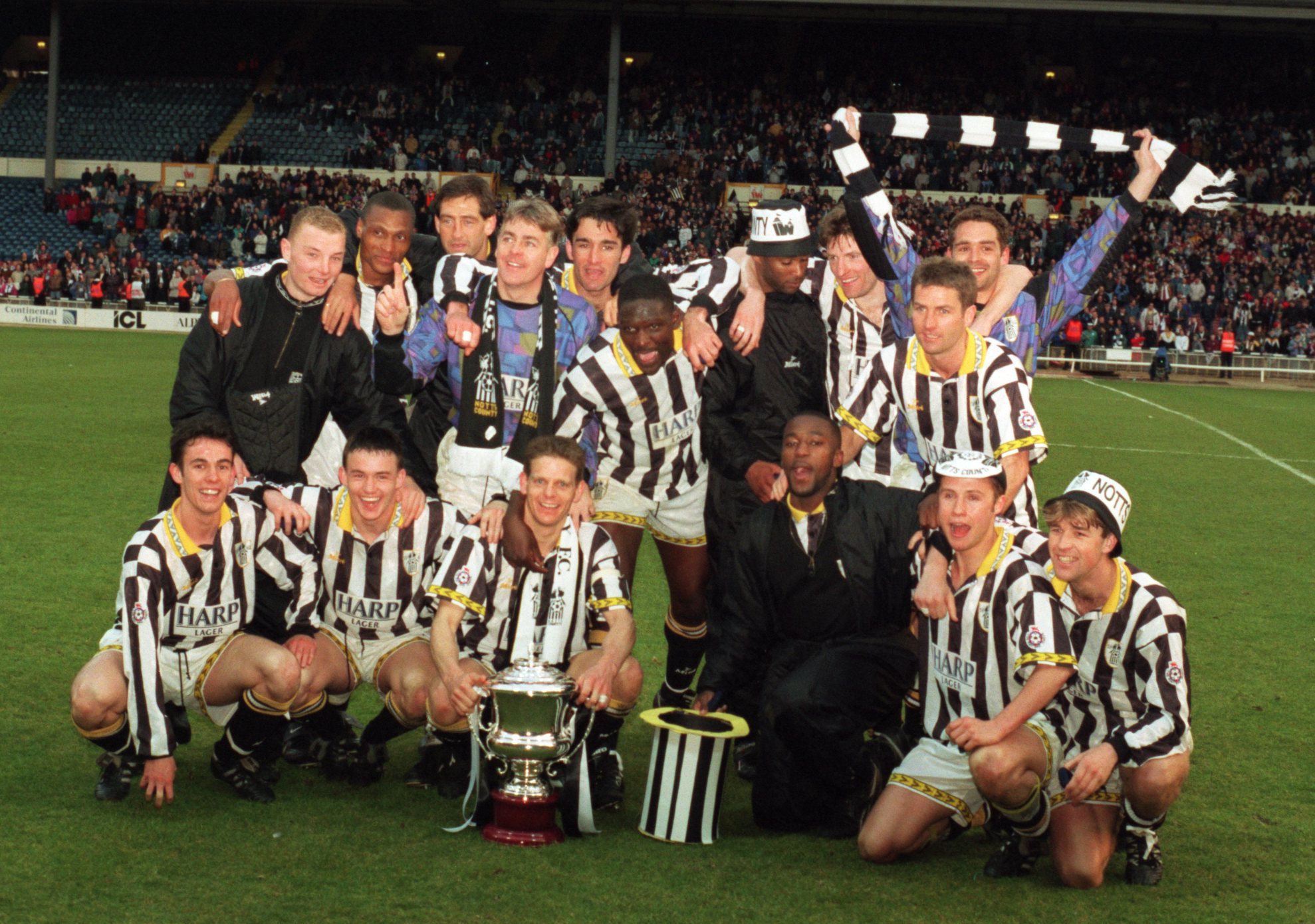 19 MAR 1995: THE NOTTS COUNTY TEAM CELEBRATE AT WEMBLEY STADIUM AFTER THEIR 2 - 1 WIN OVER ASCOLI OF ITALY IN THE ANGLO-ITALIAN CUP FINAL AT WEMBLEY STADIUM IN ENGLAND. Mandatory Credit: Mike Hewitt/ALLSPORT
