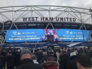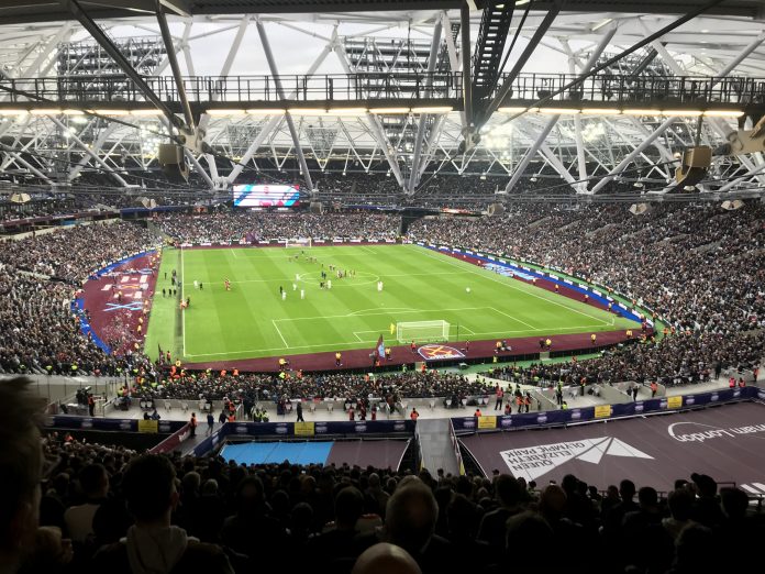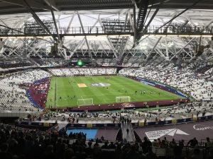 Non aspettatevi il classico stadio inglese ma la visuale è molto buona e lo stadio, contro ogni pronostico, è pazzesco. A cinque minuti dal’inizio del match ci sono ancora parecchi posti vuoti ma improvvisamente il London Stadium si riempie come un formicaio e parte l’inno del West Ham, Forever Blowling Bubbles. Tutto lo stadio canta all’unisono, brividi. Il settore ospiti si scalda e inizia ad intonare cori per i propri beniamini, atmosfera da pelle d’oca. Il London Stadium e completamente esaurito in ogni ordine di posto.