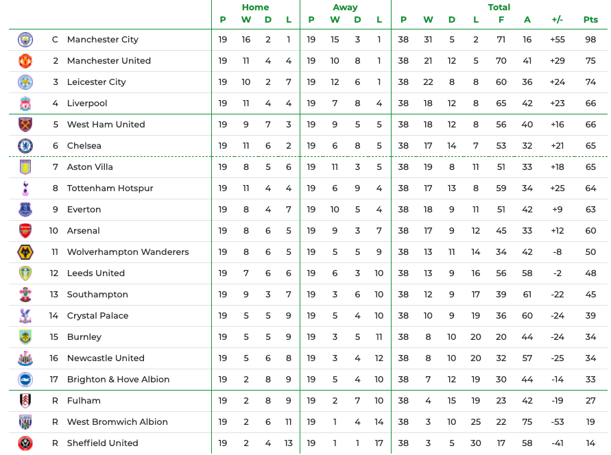 Al primo posto con oltre 20 punti di vantaggio sul Manchester United troviamo il Manchester City di Pep Guardiola, nettamente favorito per la vittoria del titolo finale. Alle spalle dei Red Devils, con un solo punto di svantaggio, ecco invece il Leicester, dato dunque tra i favoriti per la corsa alla Champions League.